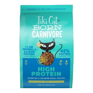 Tiki Cat Born Carnivore High Protein Dry Cat Food is packed with nutrient-rich ingredients for a complete and balanced meal for your furbaby. It gives cats the meat they need with the tasty flavors they love. This food is gently baked to preserve nutrients and flavor, and it’s packed with protein from real, high-quality herring and salmon meal to satisfy your kitty’s cravings. This low-carb food is free of potatoes, corn, wheat, and soy, and is designed with the highest standards in nutrition
