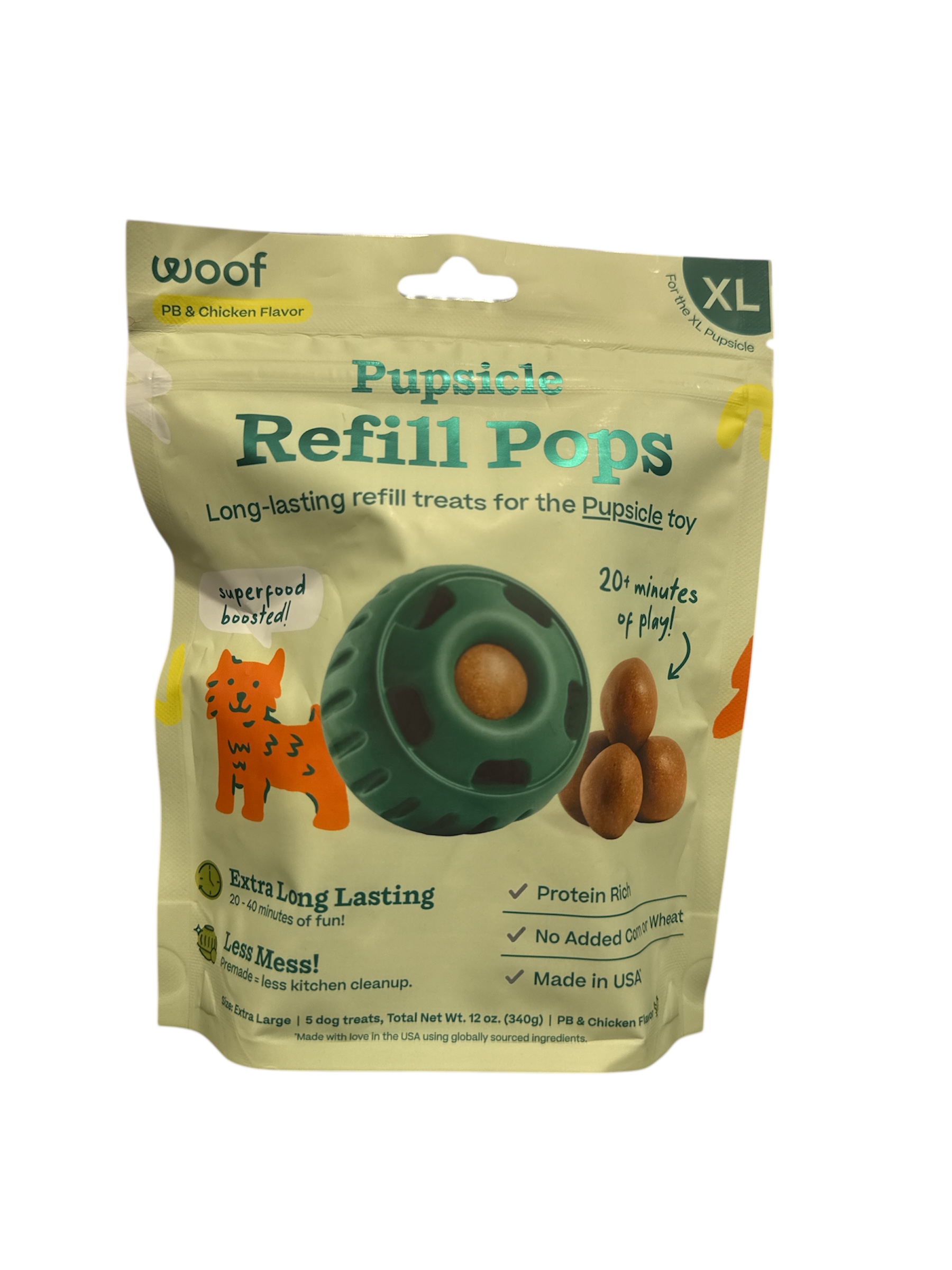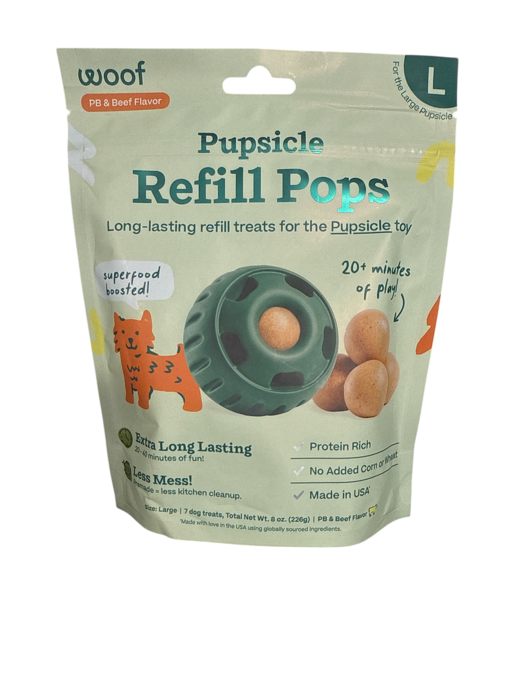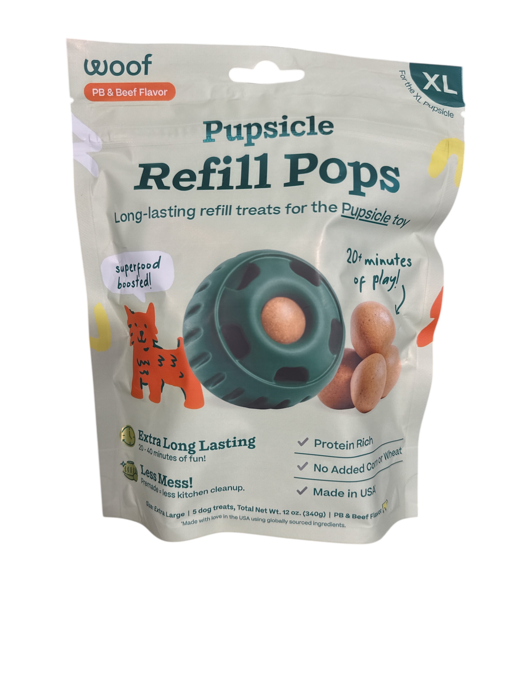 Indulge your pup with Woof Pupsicle Pops Refills Calming Beef Grain-Free Large Lickable Dog Treats. Each delicious treat is made in the USA with high-quality ingredients to nourish your furry friend. These calming pops provide 20-40 minutes of happy playtime, with the added benefit of essential nutrients to help your four-legged family member relax. Each pop contains soothing ingredients like passion flower to promote a sense of calmness. These all-natural treats are shelf-stable and don’t re