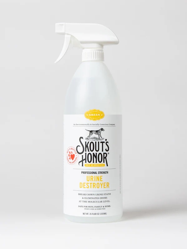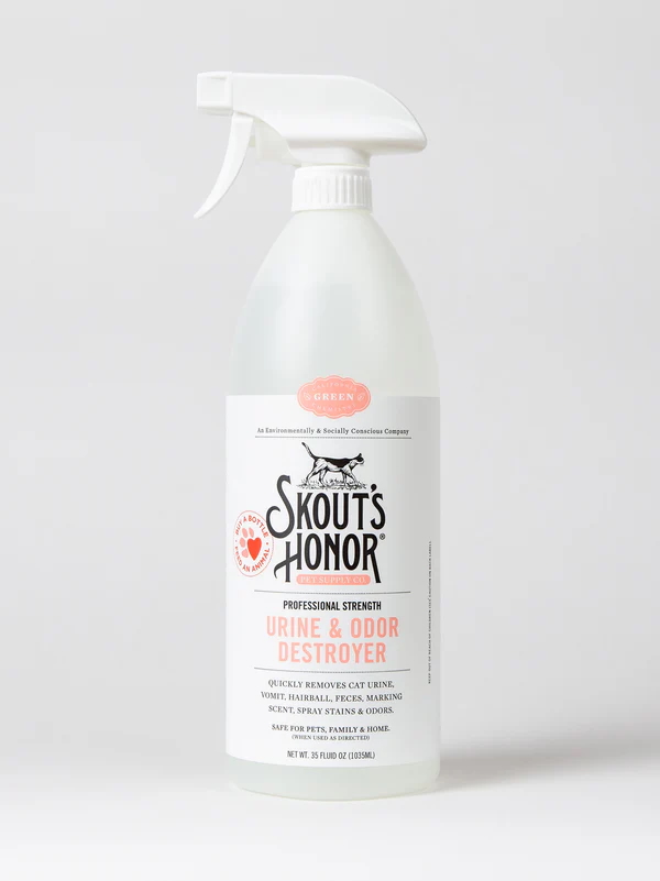 Skout's Honor Cat Urine & Odor Destroyer quickly removes cat urine from carpet, rugs, bedding, upholstery and more! It also eliminates cat urine odor for good!