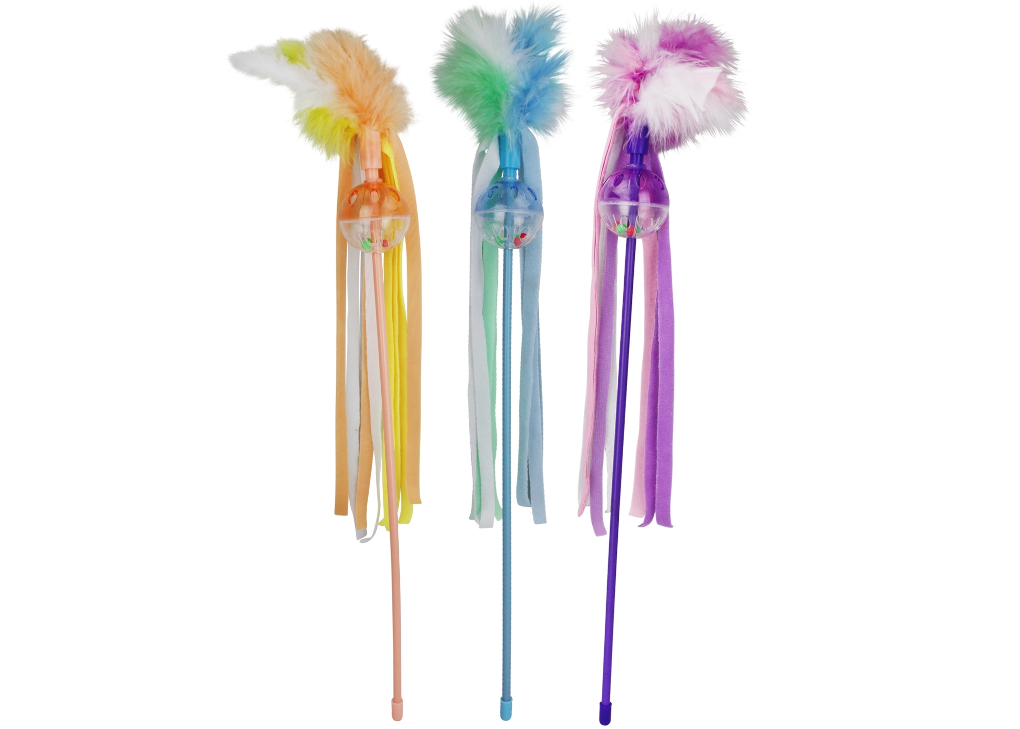 20-inch cat dangler. Bright, colorful wand that includes real bird feather that cats love to claw and bat. Ideal for interactive play.