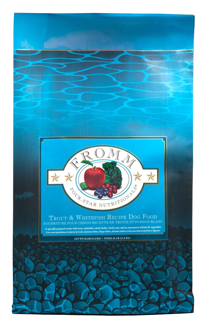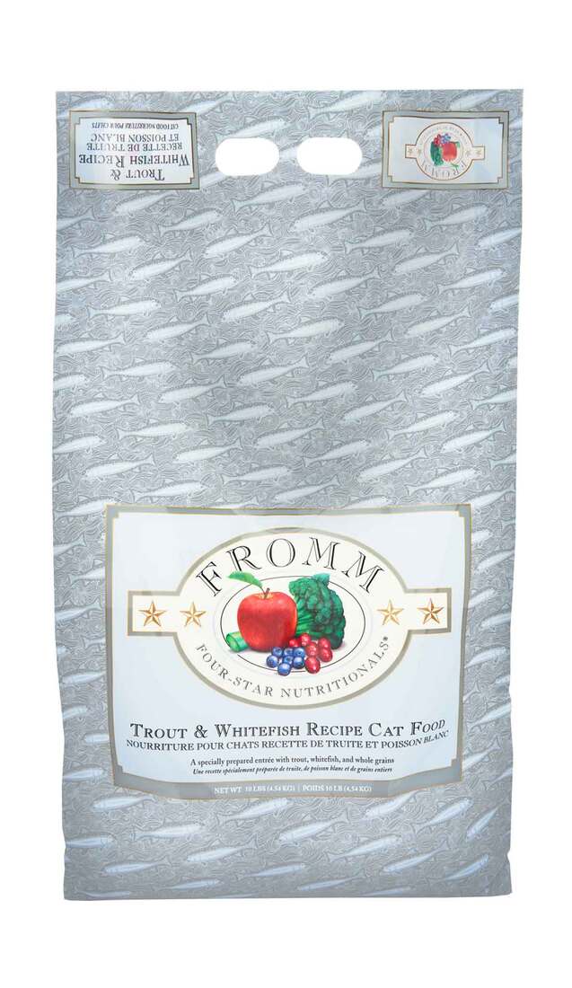 Trout; whitefish; menhaden fish meal; dried egg product; salmon meal; whole barley; whole oats; brown rice; natural flavor; canola oil (preserved with mixed tocopherols); oatmeal; pearled barley; salmon oil (preserved with mixed tocopherols); dried tomato pomace; miscanthus grass; flaxseed; dl-methionine; broccoli; apples; Vitamins [choline chloride; potassium chloride; Vitamin E supplement; niacin supplement; ascorbic acid; calcium carbonate; pyridoxine h