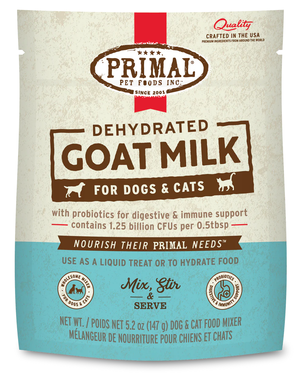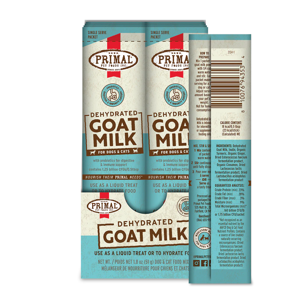 Give your pet more time in their prime with Primal Dehydrated Goat Milk. Our recipe contains probiotics that provide digestive and immune support and is sourced from certified humanely raised goats.Simply pour over your pet’s meal or serve alone as a tasty treat for a nutrient-rich way to add vital moisture to their diet. Available in two convenient options: 10-pack of single-serve stick packs and a 5.2 oz resealable pouch.