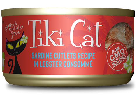 Sardine broth, sardines, tuna, lobster broth, dried egg product, sunflower seed oil , tricalcium phosphate, agar-agar, xanthan gum, potassium chloride, choline chloride, salt, magnesium sulfate, taurine, ferrous sulfate, thiamine mononitrate (vitamin B1), vitamin E supplement, niacin (vitamin B3), zinc oxide, vitamin A supplement, biotin, vitamin B12 supplement, copper amino acid chelate, manganous oxide, calcium pantothenate, riboflavin, sodium selenite, pyridoxine hydrochloride (vitamin B6)